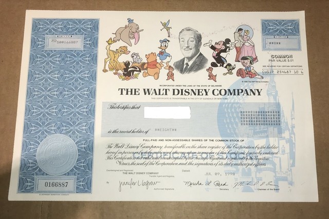 · this disney stock custom certificate features walt disney himself, surrounded by characters from his famous imagination disney stock. The disney stock certificate design remained unchanged for years except for ceo and corporate officer name changes as the company did not want in october 2013, disney announced they would no longer issue paper stock certificates effective october 16.